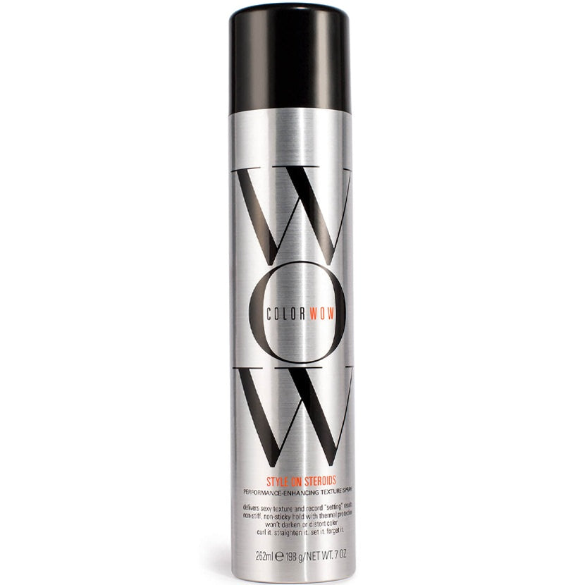 Introducing Color Wow Style on Steroids Texture & Finishing Spray! This innovative new spray is perfect for fine, flat or colour-treated hair in need of fullness and dimension. Unlike typical texture sprays that diminish colour vibrancy or clump together when heat styling, Style on Steroids features translucent Elastomers that won't dull hair, build up on the scalp or leave a chalky residue. Added micro Zeolites absorb excess oil, making it perfect for reviving second-day hair to extend life between shampoos. Style on Steroids is great for setting with hot tools, giving you instant separation and definition with a thermal protectant formula.